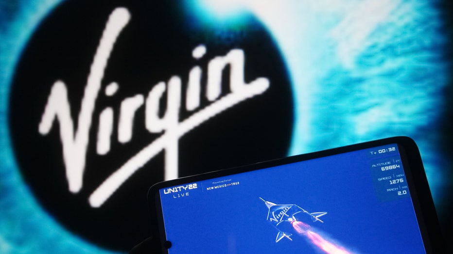 In this photo illustration, Virgin Galactic VSS Unity space plane is seen on a fragment of a Virgin Galactic Unity 22 Spaceflight Livestream Youtube video (Photo Illustration by Pavlo Gonchar/SOPA Images/LightRocket via Getty Images)