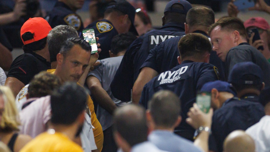 Security guards and, later, more than a half-dozen police officers went over to confront the protesters, who were wearing shirts that read, "End Fossil Fuels." The U.S. Tennis Association said three of the protesters were escorted out of the stadium without further incident, but it took longer to remove the person who stuck his feet to the ground.