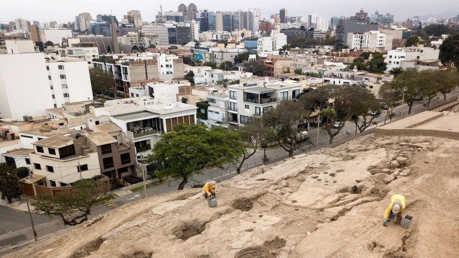 Aerial view showing workers excavating in the Huaca (Sanctuary) Pucllana, in the heart of a residential area in the district of Miraflores in Lima, where they uncovered a mummy belonging to the pre-Inca Ychsma culture buried in a shallow funeral cham