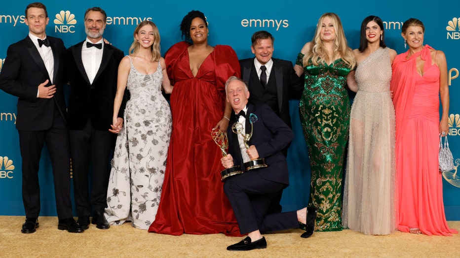 FILE-(L-R) Jake Lacy, Murray Bartlett, Sydney Sweeney, Natasha Rothwell, Mike White, Steve Zahn, Jennifer Coolidge, Alexandra Daddario, and Connie Britton winners of Outstanding Limited or Anthology Series or Movie for "The White Lotus", pose in the