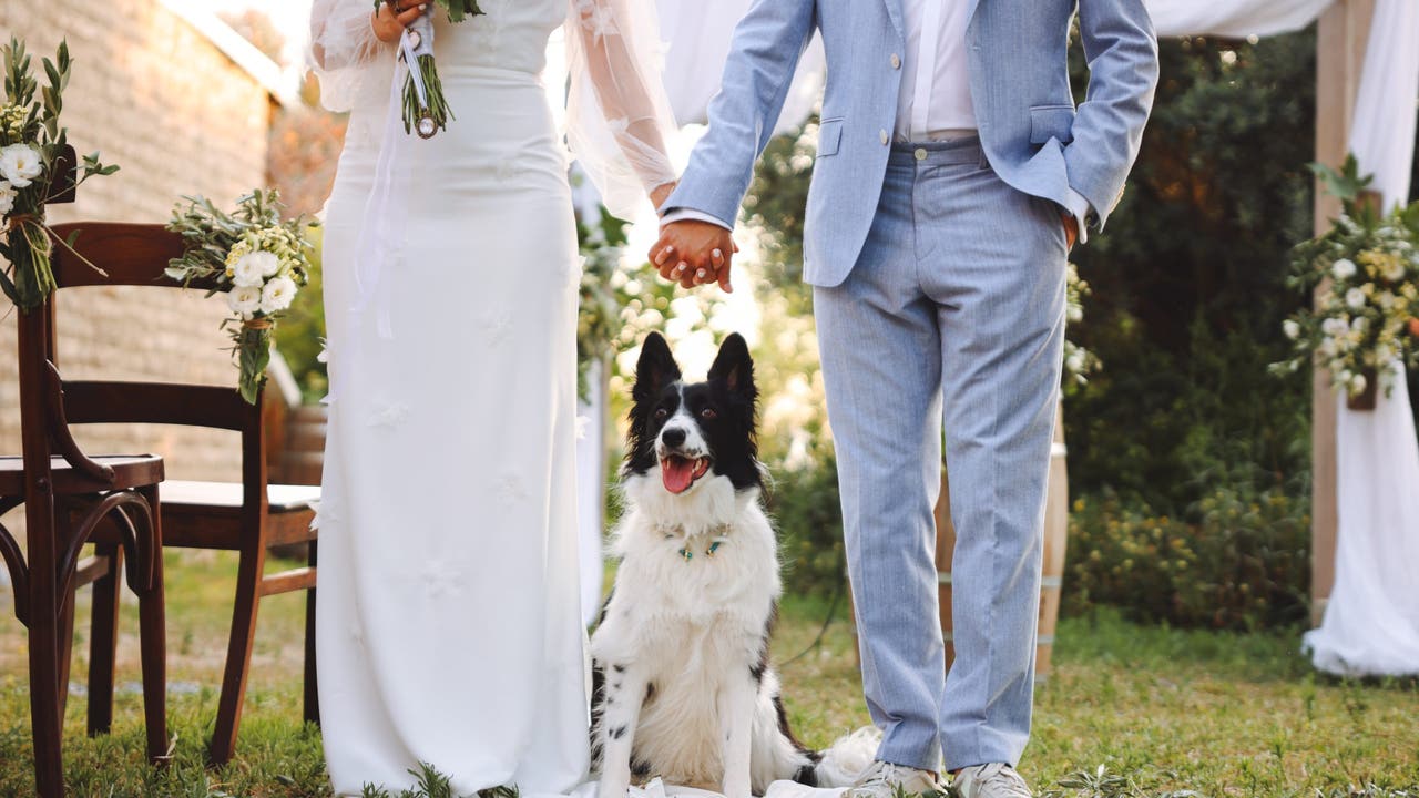 FILE - A bride and groom hold hands with their dog sitting between them during an outdoor wedding ceremony. (Getty Images. )