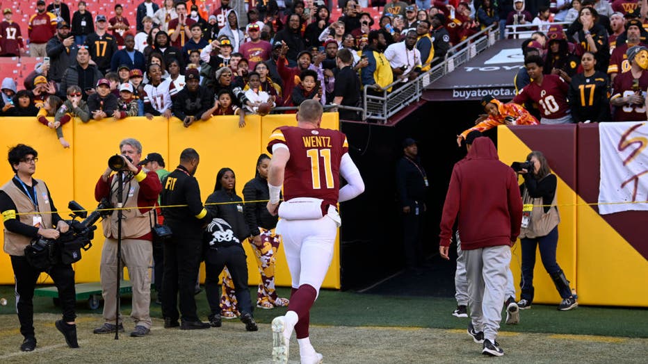 LANDOVER, MD- JANUARY 1: Washington Commanders quarterback Carson Wentz (11) run into the locker room after the Cleveland Browns defeat of the Washington Commanders at FedEX Field on January 1, 2023 in Landover MD. (Photo by John McDonnell/The Washin
