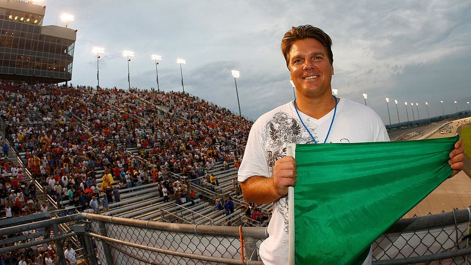 Former NFL player Frank Wycheck holds the green flag during pre-race activities for the NASCAR Camping World Truck Series Toyota Tundra 200 at Nashville Superspeedway on August 1, 2009 in Lebanon, Tennessee. (Photo by Jason Smith/Getty Images for NAS