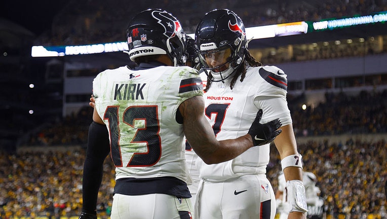 FILE-Christian Kirk #13 of the Houston Texans and C.J. Stroud #7 of the Houston Texans celebrate after a touchdown in the second quarter of an NFL wild card playoff game against the Pittsburgh Steelers at Acrisure Stadium on January 12, 2026 in Pitts