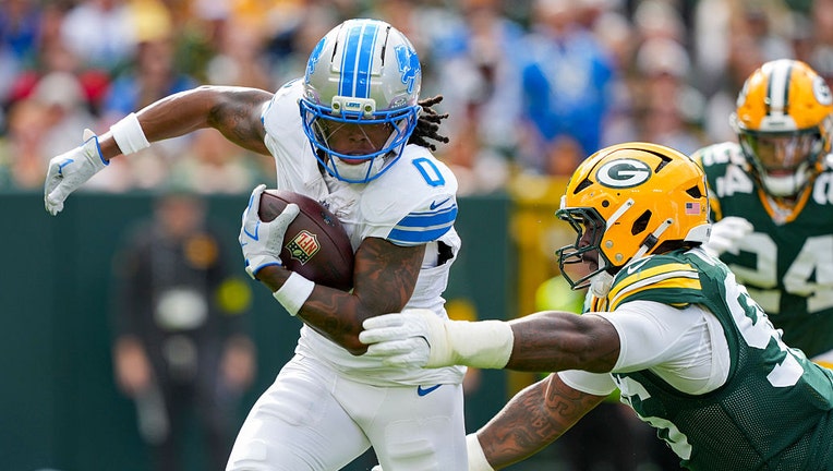FILE-Jahmyr Gibbs #0 of the Detroit Lions runs the ball during the first half of an NFL football game against the Green Bay Packers at Lambeau Field on September 7, 2025 in Green Bay, Wisconsin. (Photo by Todd Rosenberg/Getty Images)