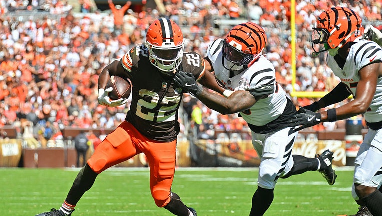 Dylan Sampson #22 of the Cleveland Browns runs the ball during the third quarter against the Cincinnati Bengals during the game at Huntington Bank Field on September 07, 2025 in Cleveland, Ohio. (Photo by Jason Miller/Getty Images)