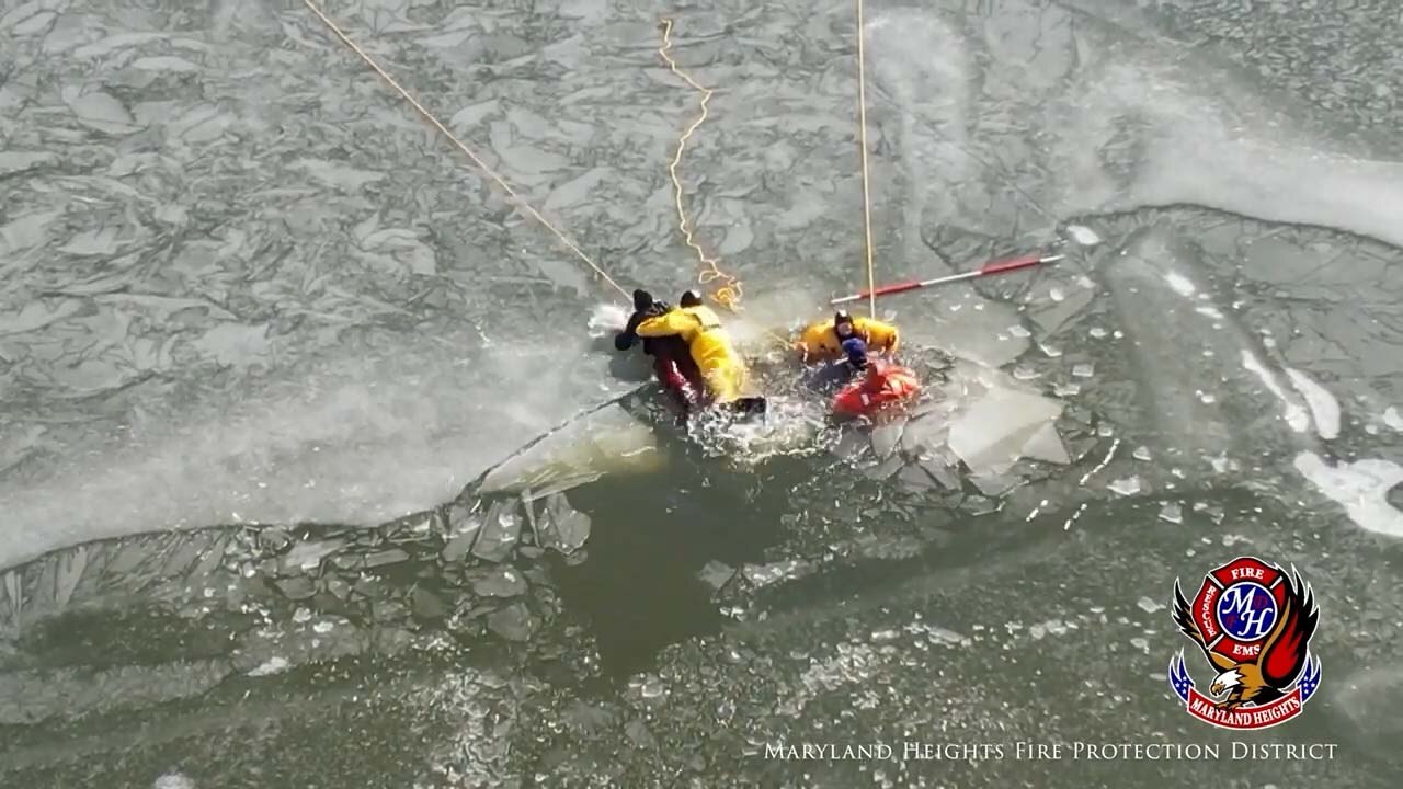 Two teenagers were rescued from an icy lake in St Louis, Missouri, when, in a stroke of luck, nearby firefighters spied the pair falling through the ice during a training drill on Feb. 8. (Credit: Maryland Heights Fire Protection District via Storyful)