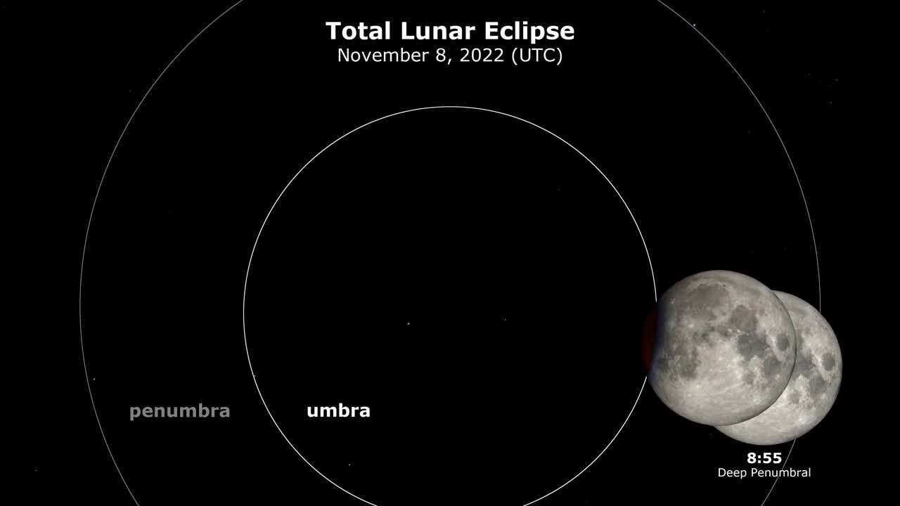 The moon moves right to left, passing through the penumbra and umbra, leaving in its wake an eclipse diagram with the times at various stages of the eclipse. Times are shown in Coordinated Universal Time (UTC). (Credit: NASA Goddard Space Flight Center/Scientific Visualization Studio)