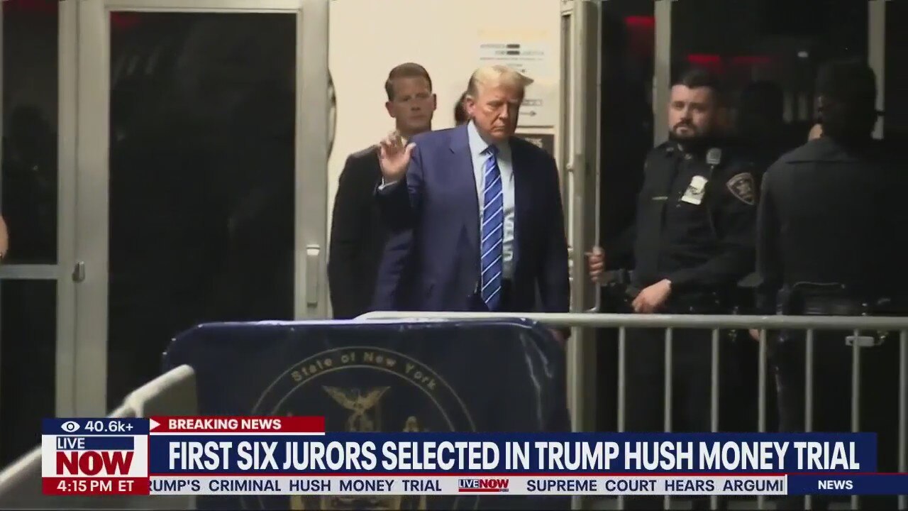 The first six jurors have been seated in the Trump hush money trial following hours of questioning and a process of elimination. Twelve more jurors still need to be picked. Jury selection was expected to last two weeks.