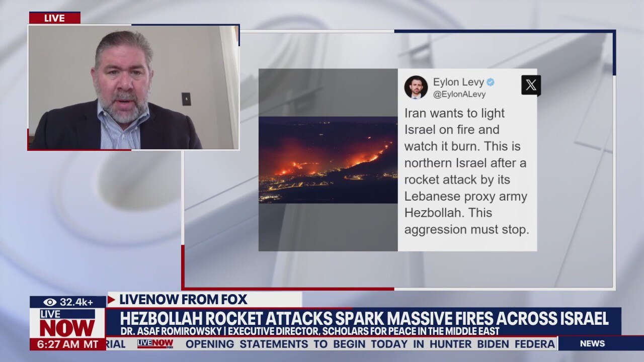 Large swaths of northern Israel are engulfed by wild fires set off by rockets launched from Lebanon by the militant group Hezbollah. Eylon Levy sharing this photo out of Israel saying "Iran wants to light Israel on fire and watch it burn." Dr. Asaf Romirowsky, Executive Director of Scholars For Peace in the Middle East weighs in.