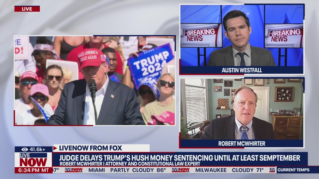 Former President Donald Trump's hush money sentencing was delayed until September. He is now seeking to toss out his felony conviction following the Supreme Court's immunity ruling Monday. Robert McWhirter, an attorney and constitutional law expert joins LiveNOW from FOX's Austin Westfall to break it down.