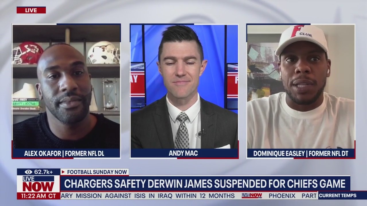 Former NFL defensive linemen Alex Okafor and Dominique Easley join LiveNOW's Andy Mac to discuss top NFL headlines, including the Week 4 suspension of Chargers' safety Derwin James.