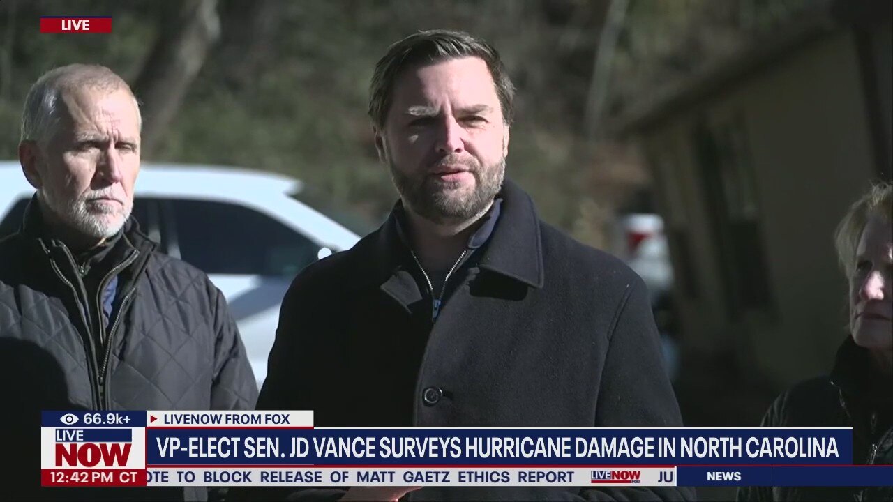 Vice President-elect JD Vance traveled Friday to Fairview, North Carolina, to survey Hurricane Helene recovery efforts. Vance met with first responders and visited a home renovation project.