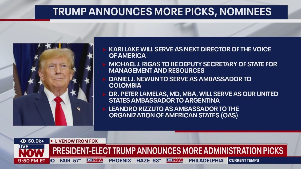 President-elect Donald Trump announced additional picks and nominations on Wednesday. Trump said in a statement on X, "I am pleased to announce that Kari Lake will serve as our next Director of the Voice of America. She will be appointed by, and work closely with, our next head of the U.S. Agency for Global Media, who I will announce soon, to ensure that the American values of Freedom and Liberty are broadcast around the World FAIRLY and ACCURATELY, unlike the lies spread by the Fake News Media."