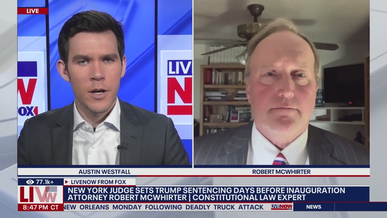 President-elect Trump's bid to toss his conviction in his New York criminal "hush money" case was denied on Friday. New York Judge Juan Merchan rejected Trump's request to vacate the verdict in the case based on the Supreme Court's presidential immunity decision, and has set his sentencing for January 10th, giving Trump the option to appear in person or virtually. LiveNOW's Austin Westfall discusses it further with constitutional law expert Robert McWhirter.