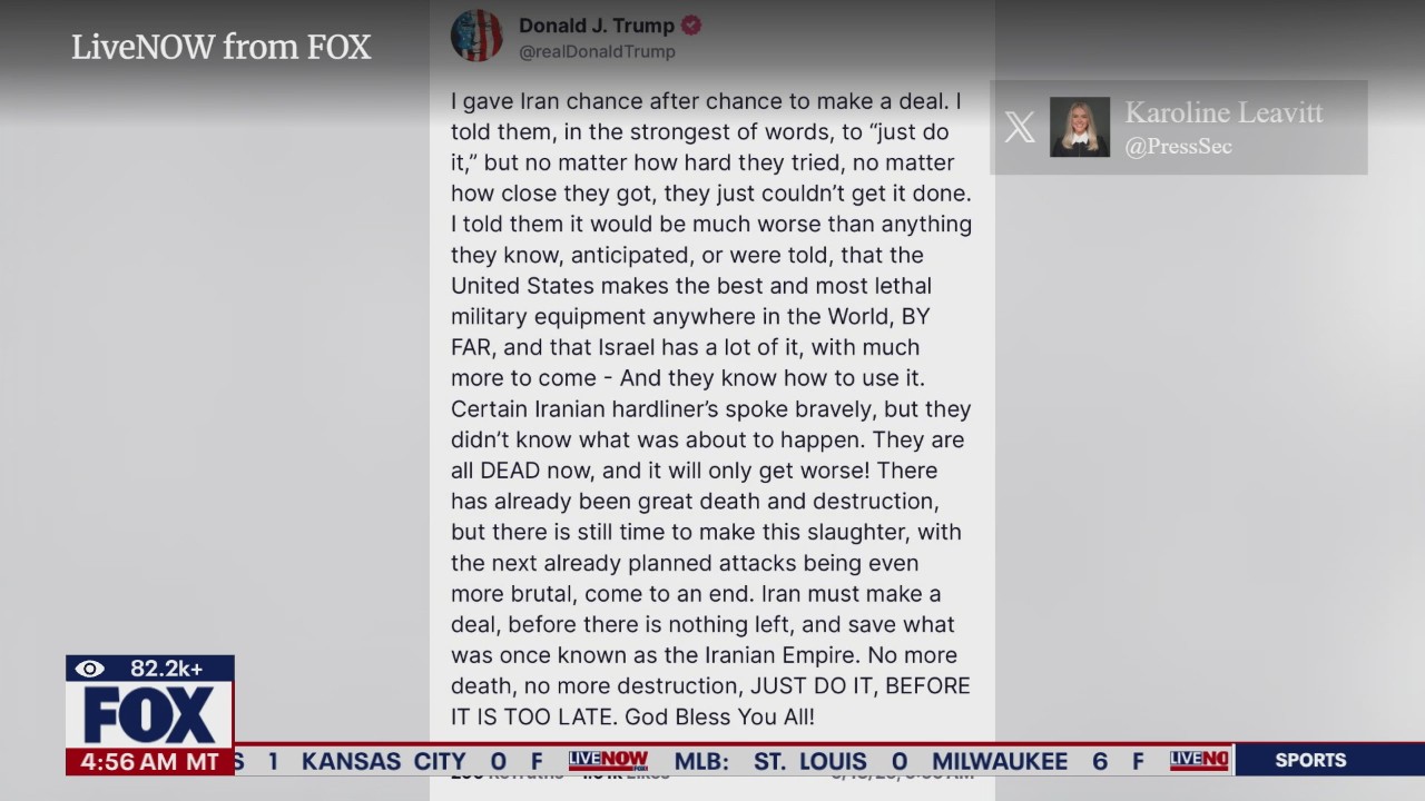 President Donald Trump on Friday morning urged Tehran to reach a nuclear deal “before there is nothing left,” hours after Israel launched a wave of airstrikes against Iran, killing at least 4 top leaders. In the post from the Presidents Truth Social account he writes: "I gave Iran chance after chance to make a deal. I told them, in the strongest of words, to “just do it,” but no matter how hard they tried, no matter how close they got, they just couldn’t get it done. I told them it would be much worse than anything they know, anticipated, or were told, that the United States makes the best and most lethal military equipment anywhere in the World, BY FAR, and that Israel has a lot of it, with much more to come - And they know how to use it. Certain Iranian hardliner’s spoke bravely, but they didn’t know what was about to happen. They are all DEAD now, and it will only get worse! There has already been great death and destruction, but there is still time to make this slaughter, with the next already planned attacks being even more brutal, come to an end. Iran must make a deal, before there is nothing left, and save what was once known as the Iranian Empire. No more death, no more destruction, JUST DO IT, BEFORE IT IS TOO LATE. God Bless You All!"