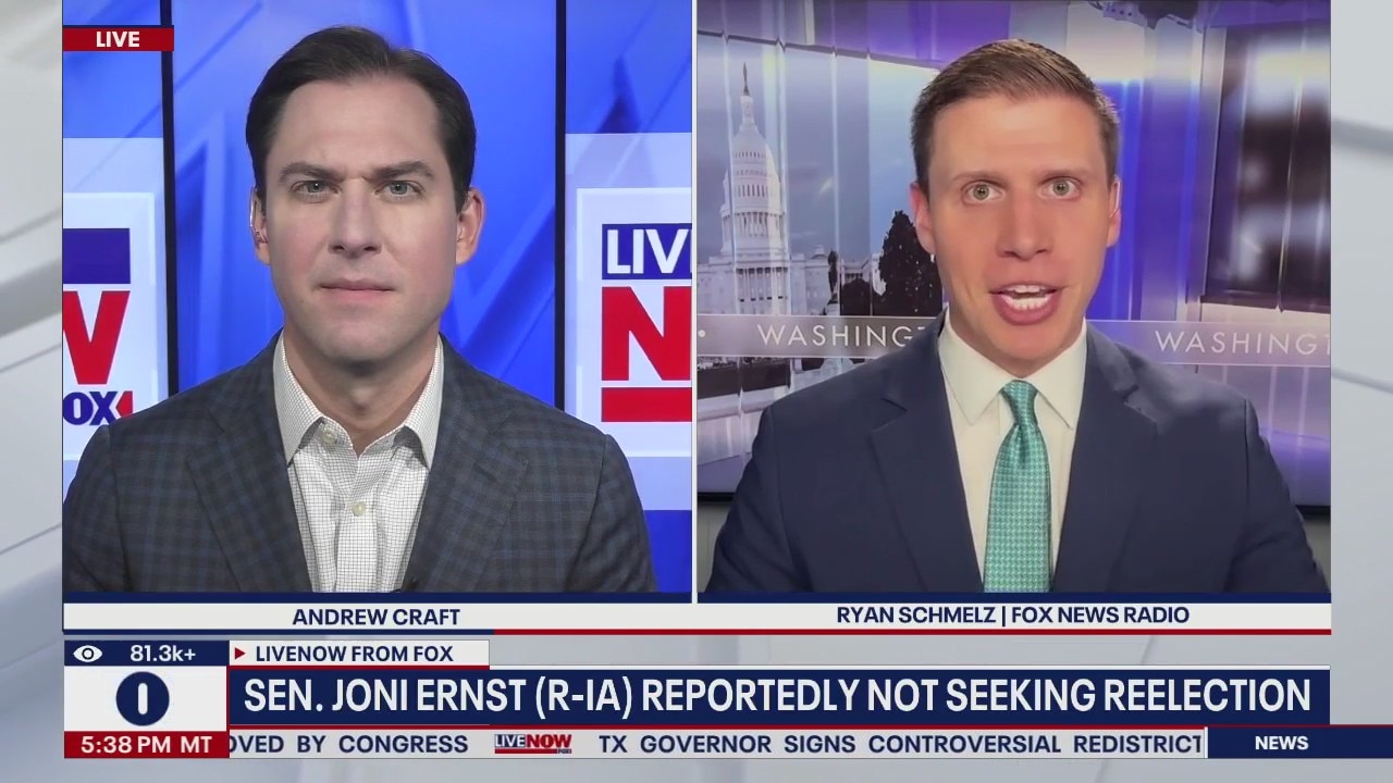 Fox News Radio's Ryan Schmelz joins LiveNOW's Andrew Craft to discuss the implications of Iowa Sen. Joni Ernst reportedly not seeking reelection in 2026.