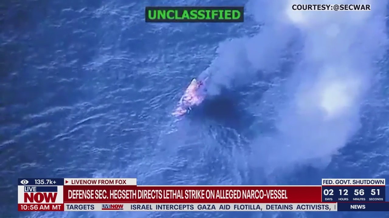 Video shows the moment U.S. forces conducted a strike Friday morning against an alleged drug boat off the coast of Venezuela, according to an X post by Secretary of Defense Pete Hegseth. Four were killed in the strike. In his post, Hegseth said that “our intelligence, without a doubt, confirmed that this vessel was trafficking narcotics, the people onboard were narco-terrorists, and they were operating on a known narco-trafficking transit route.”