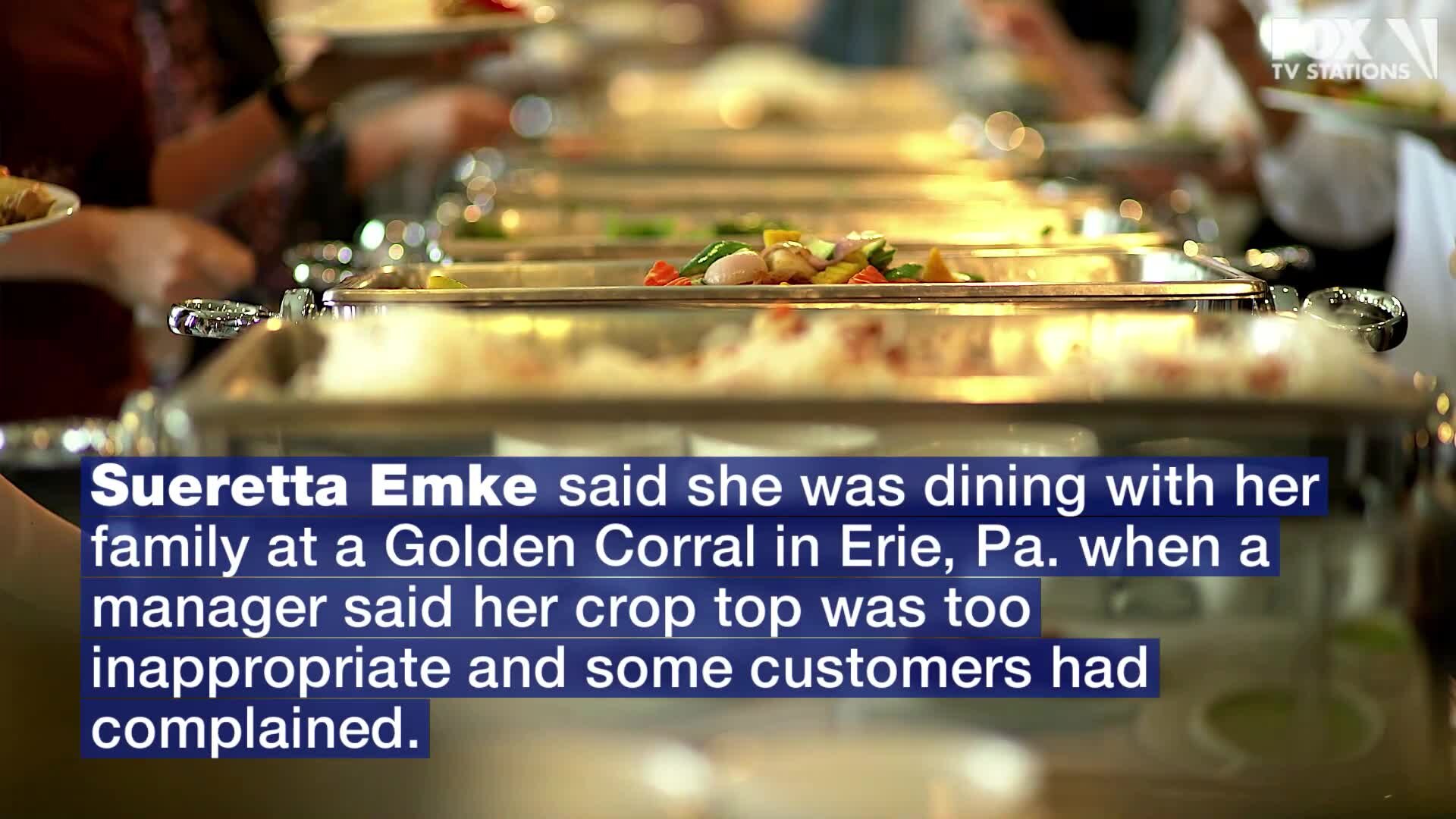 Sueretta Emke said she was dining with her family at a Golden Corral when a manager said her crop top was too inappropriate and some customers had complained.