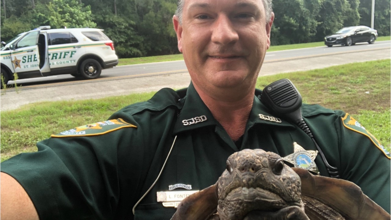 Officer snaps selfie with turtle ?detained? for crossing road too slowly