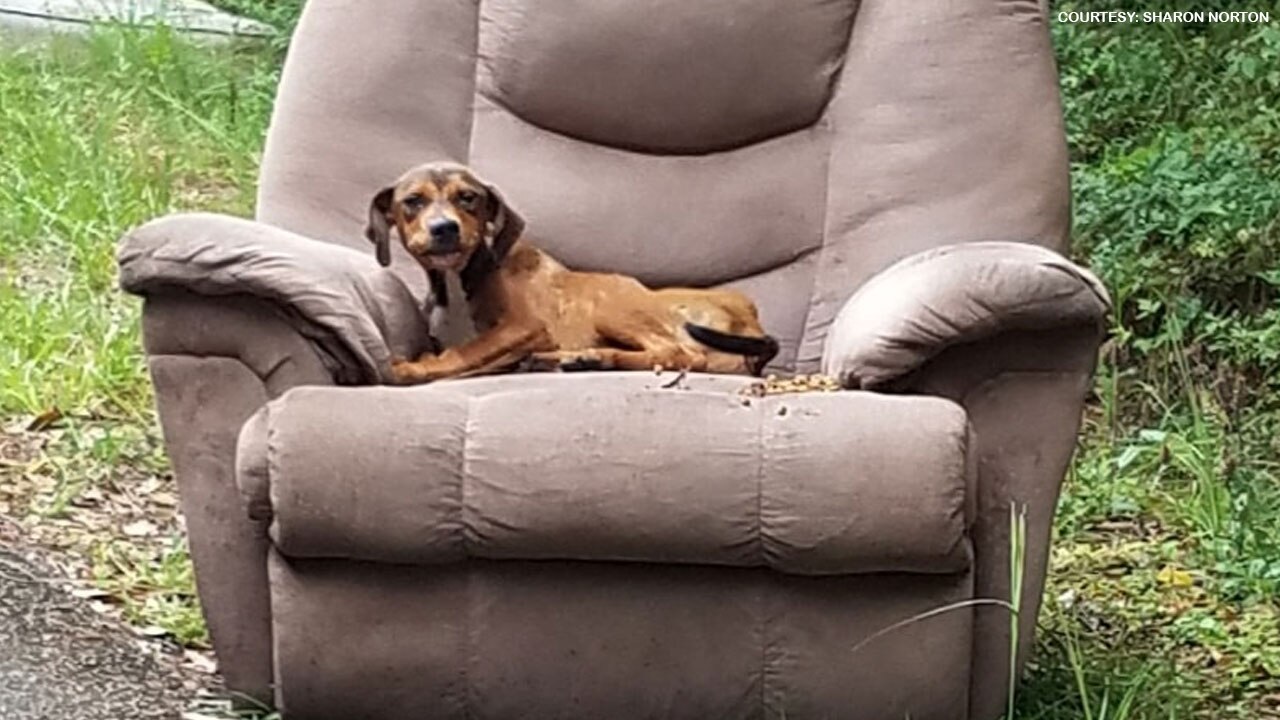 The owners of a puppy left him to starve in a broken armchair along the side of the road.