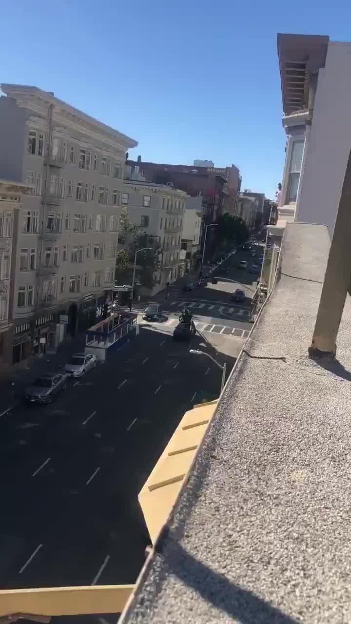 Video shows crew filming a speeding bus crashing into parked cars in San Francisco.(Credit: JaszyyE via Storyful)