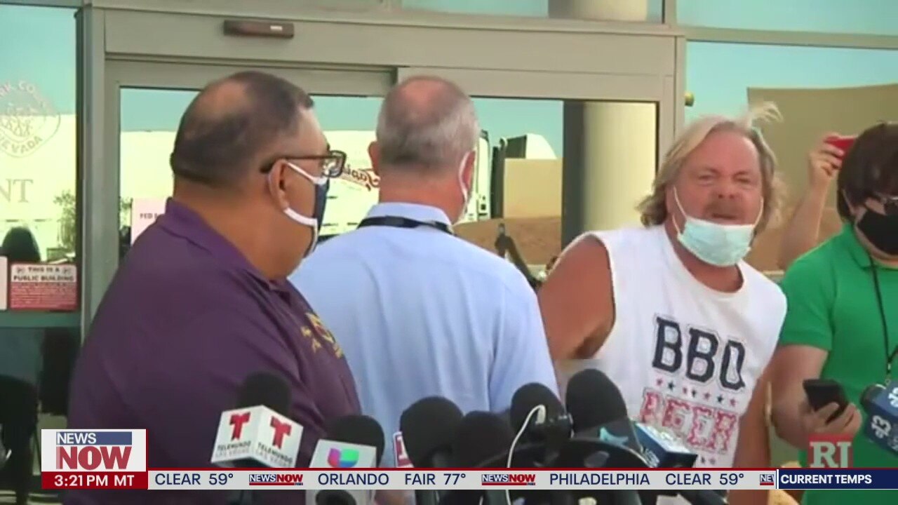 Man wearing ?BBQ, BEER, FREEDOM? shirt interrupts Nevada press conference