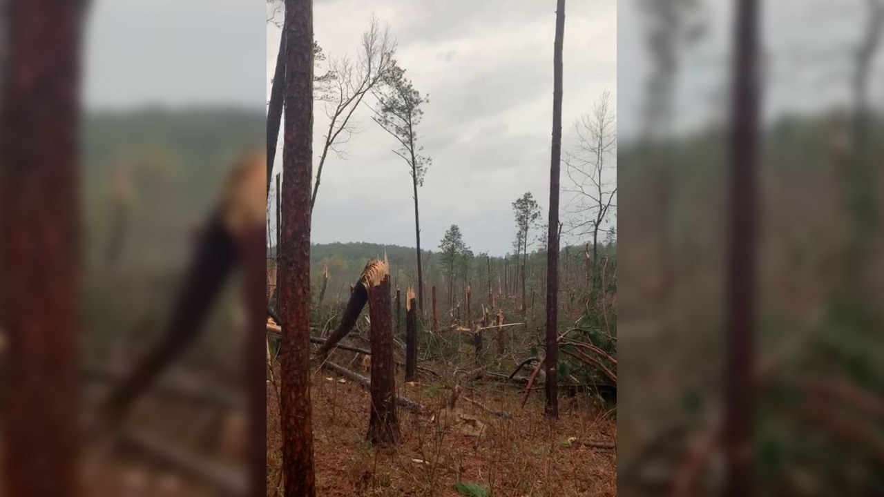 Video released by the Alabama Wildlife and Freshwater Fisheries Division shows damage to trees in the Oakmulgee Wildlife Management Area. (Credit: Alabama Wildlife and Freshwater Fisheries Division via Storyful)