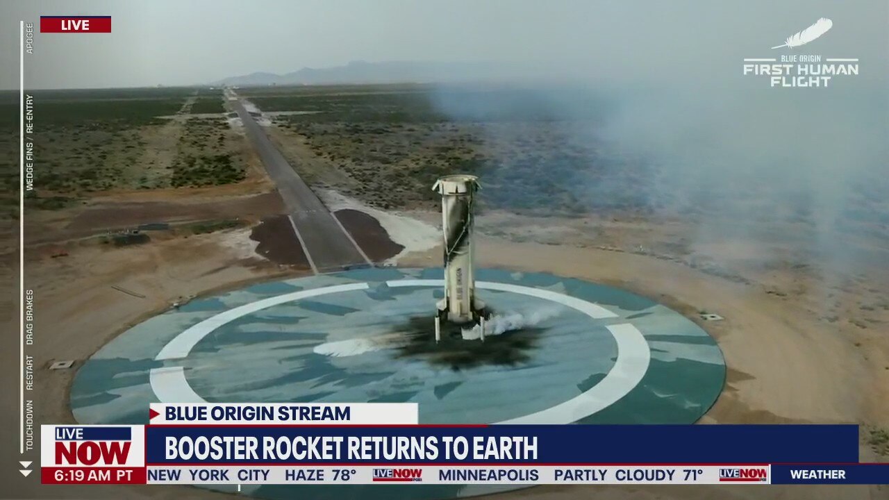 Booster rocket connected to the New Shepard capsule returned to earth. The capsule with Jeff Bezos, his brother Mark Bezos, 18 year-old Oliver Daemen and 82 year-old Wally Funk.
