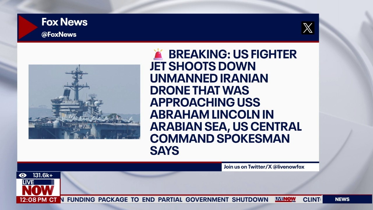 The U.S. Central Command says a U.S. fighter jet struck down an unmanned Iranian drone that was approaching USS Abraham Lincoln in the Arabian Sea.