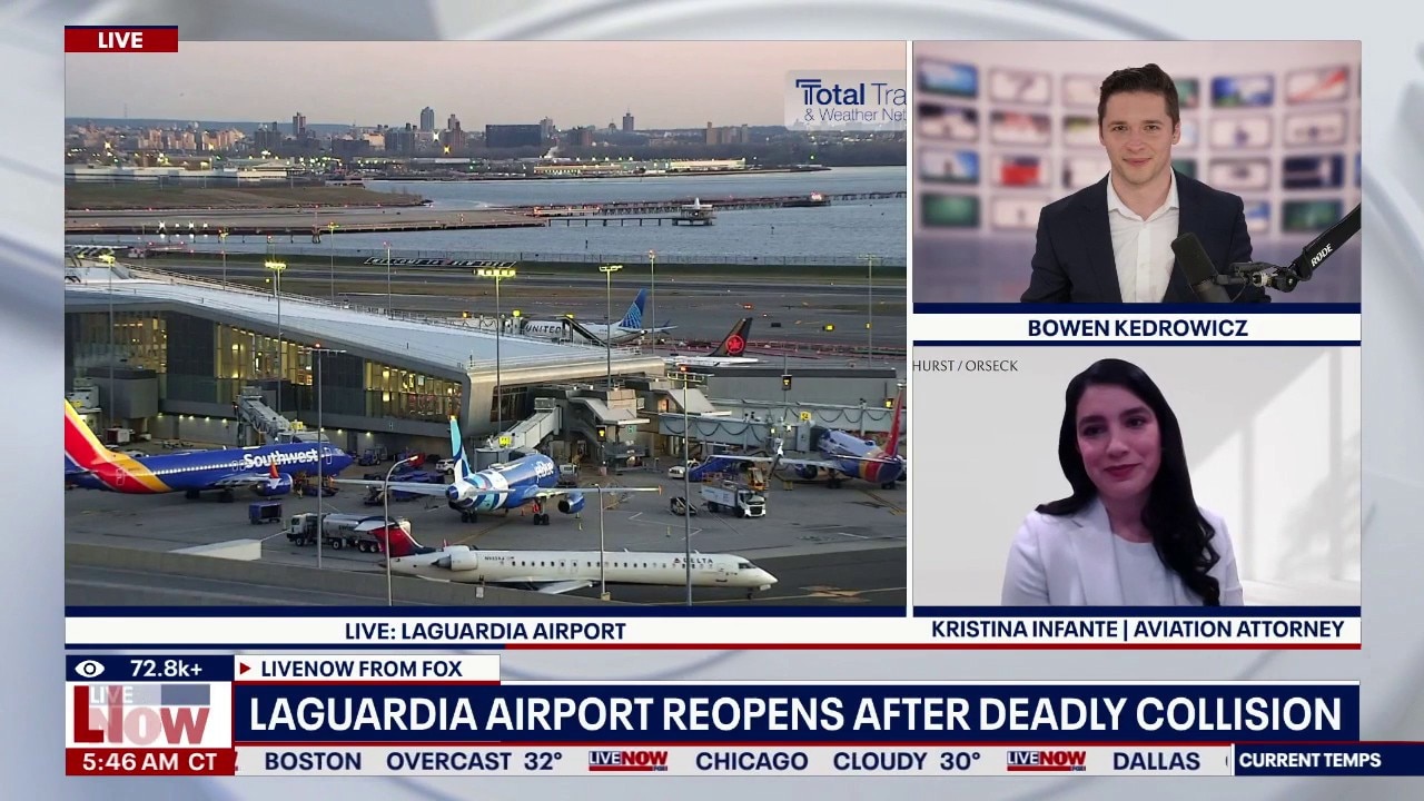 NTSB continues to investigate an airport collision that left two pilots dead. New York’s LaGuardia Airport was closed for hours after an Air Canada plane collided with a fire truck while landing Sunday night. The pilot and copilot were killed and both fire officers were injured, Kristina Infante an Aviation Attorney weighs in.