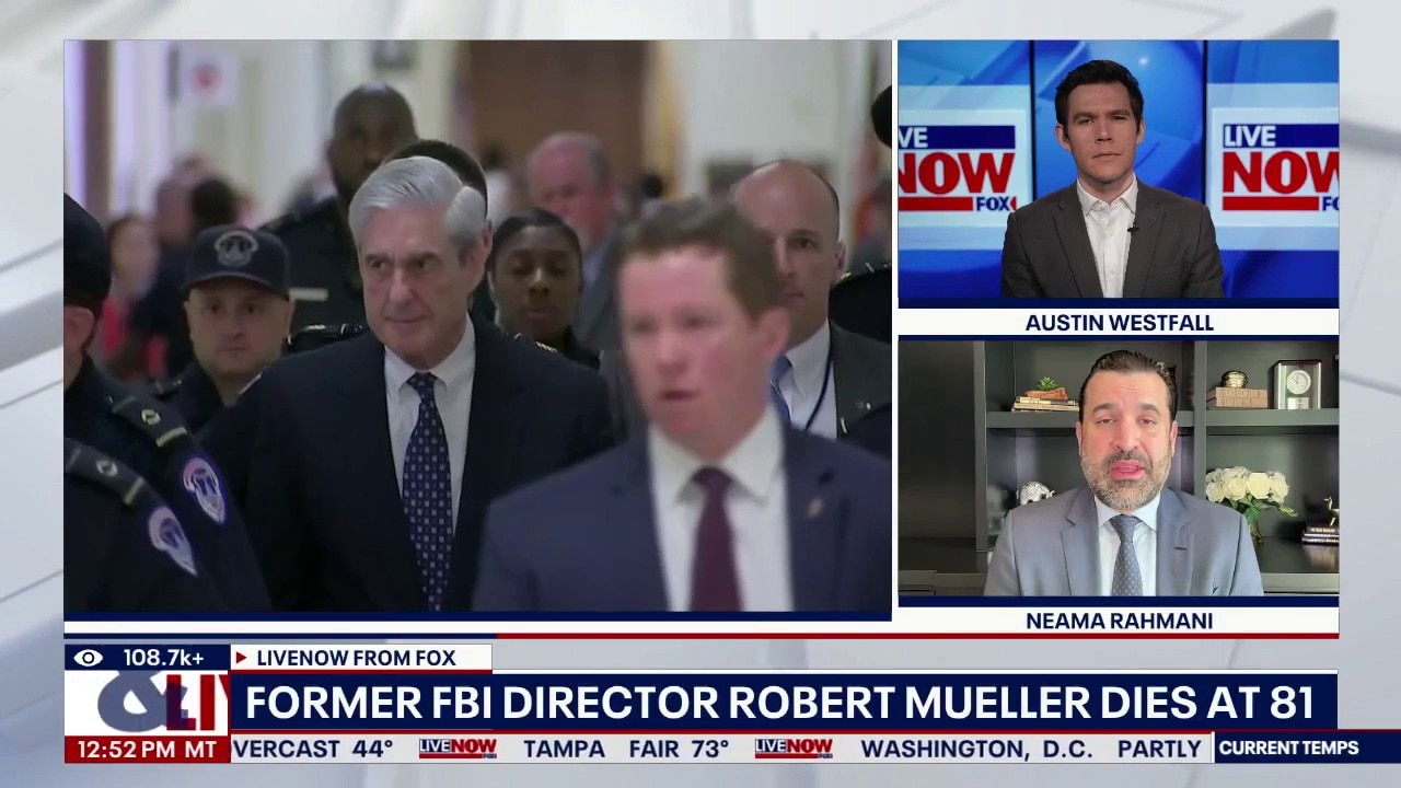 Former federal prosecutor and legal analyst Neama Rahmani joins LiveNOW's Austin Westfall to discuss the career and legacy of Robert Mueller, the former FBI director and special counsel who spearheaded the investigation into alleged collusion between President Trump's 2016 presidential campaign and Russia. Mueller has died at 81. President Trump said in a social media post on Saturday that he was 'glad' Mueller is dead.