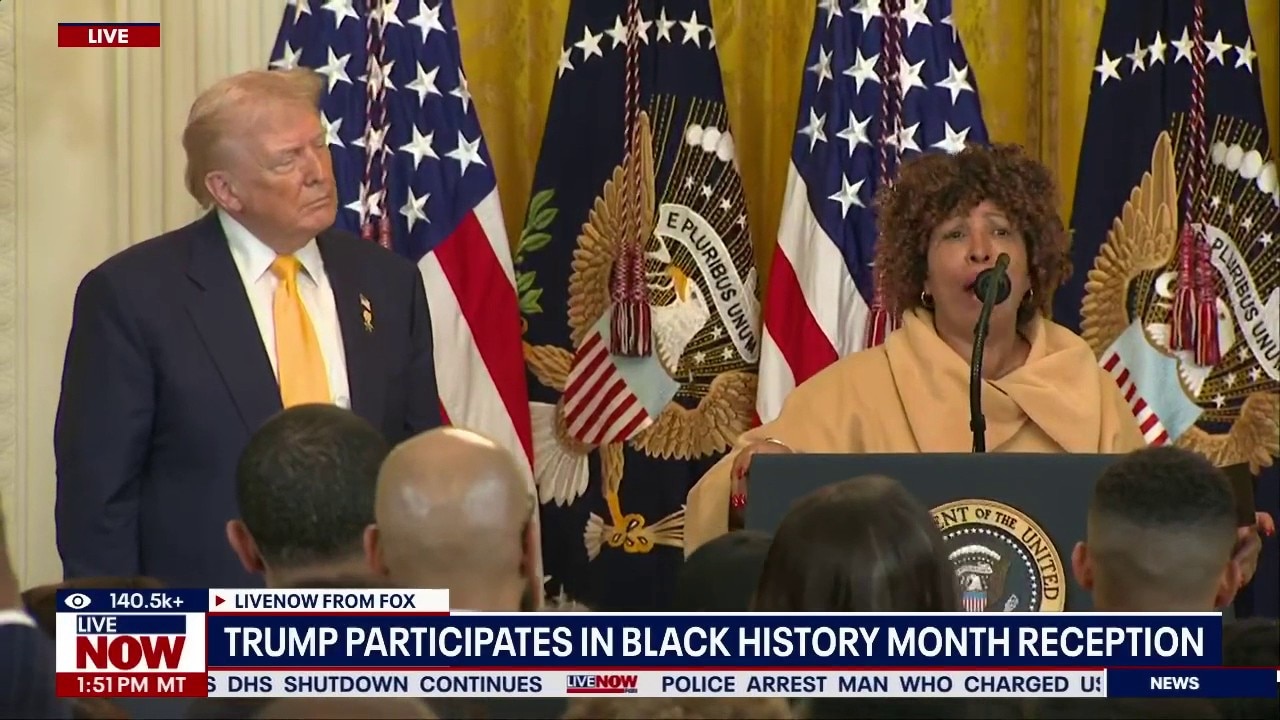 President Trump participated in a Black History Month reception in the East Room of the White House on Wednesday. HUD Secretary Scott Turner and former HUD Secretary Ben Carson joined Trump at the beginning of the event. Forlesia Cook and other supporters joined him on stage near the end of the event.