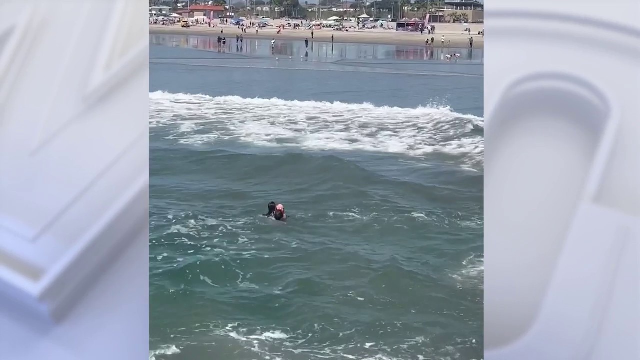 A Southern California surf coach was hailed a hero after saving a father and daughter from a rip current in Oceanside Harbor. (Credit: Kim Rose via Storyful)