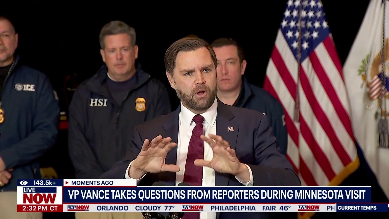 Vice President JD Vance takes questions from reporters after visiting Minnesota amid ongoing ICE operations.