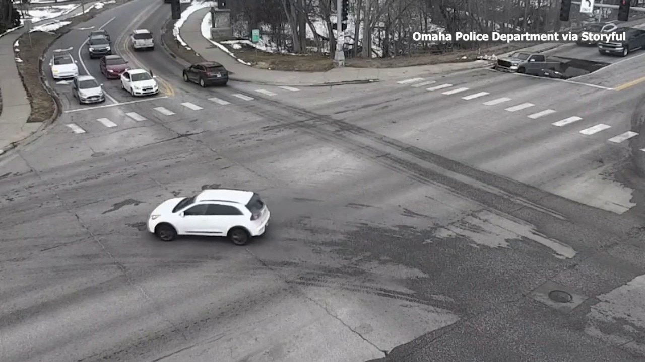 Two vehicles were abruptly swallowed by a sinkhole while stopped at an Omaha intersection on February 24, as captured by a nearby parking garage security camera.