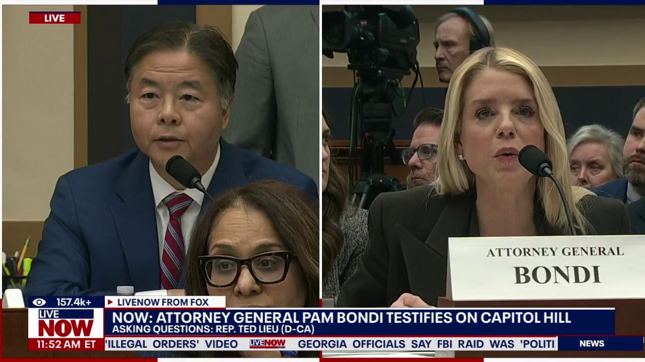 AG Pam Bondi gets into heated exchange with Rep. Ted Lieu after he accuses her of lying under oath.