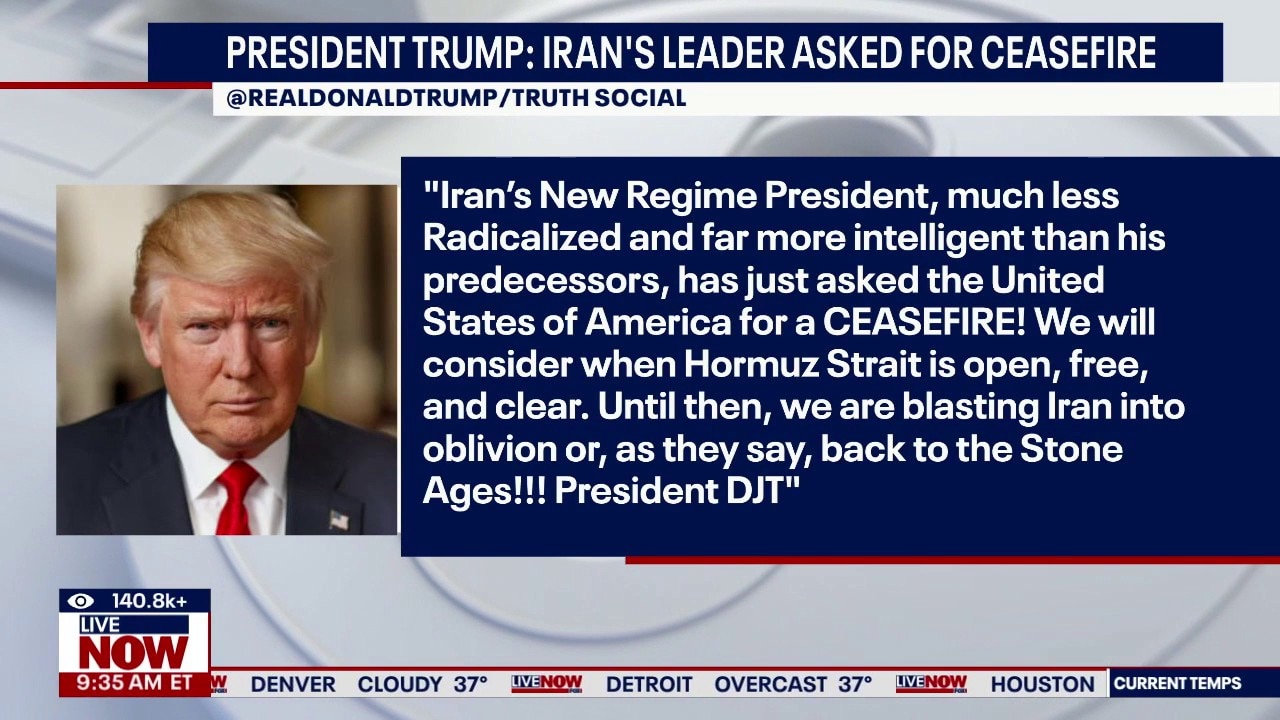 President Trump says Iran is now asking for a ceasefire. This comes as president Trump is set to address the nation at 9PM on operations in Iran. Here's what the president had to say on Truth Social: "Iran’s New Regime President, much less Radicalized and far more intelligent than his predecessors, has just asked the United States of America for a CEASEFIRE! We will consider when Hormuz Strait is open, free, and clear. Until then, we are blasting Iran into oblivion or, as they say, back to the Stone Ages!!! President DJT"