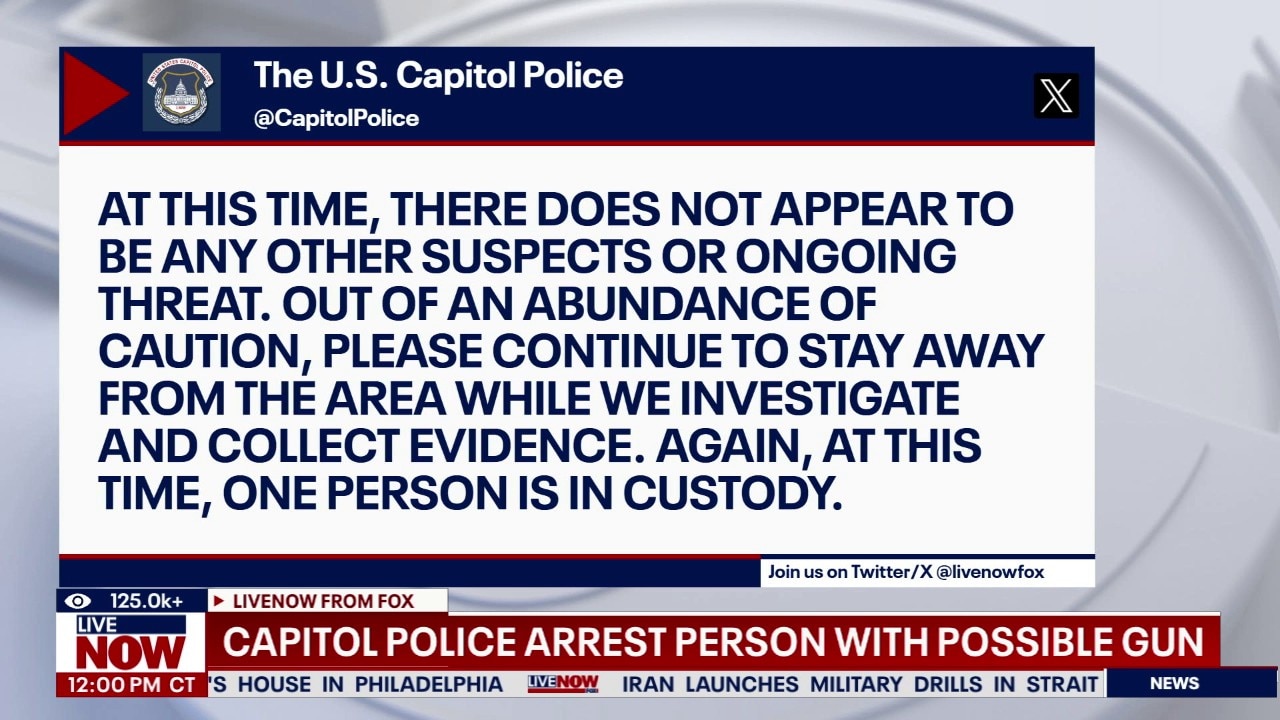 Capitol Police posted on X: "Our officers just arrested a person with what appears to be a gun near the West Front of the U.S. Capitol Building. Please avoid the area. We will provide more information when new information is confirmed."