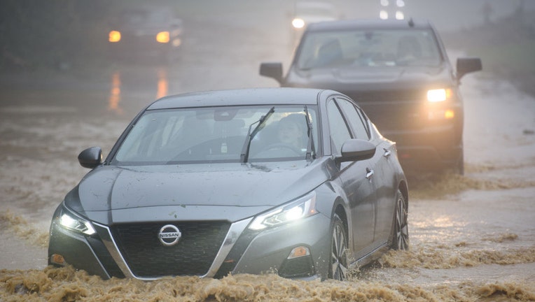 Vehicles drive through high water on NC highway 321 on September 27, 2024 in Boone, North Carolina. Rains from what was Hurricane Helene have dropped more than a foot of rain across much of the region. (Photo by Melissa Sue Gerrits/Getty Images)