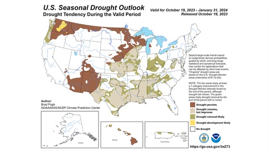 "During late October, heavy precipitation is likely to result in drought improvement for the central U.S.," said Brad Pugh, operational drought lead with NOAA’s Climate Prediction Center. "El Niño with its enhanced precipitation is expected to provide drought relief to the southern U.S. during the next few months."